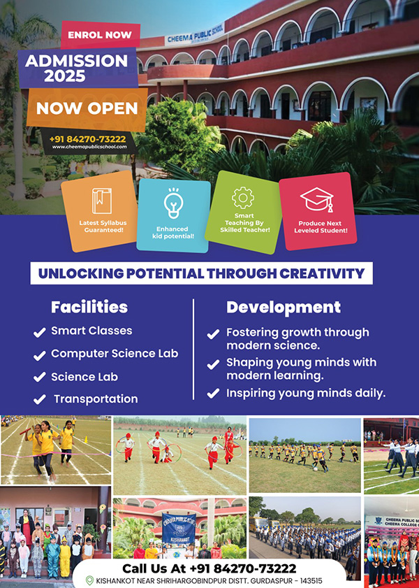 Cheema Public School provides quality education with a focus on academic excellence and holistic development. With modern facilities and experienced faculty, the school nurtures students to excel in academics, sports, and extracurricular activities.